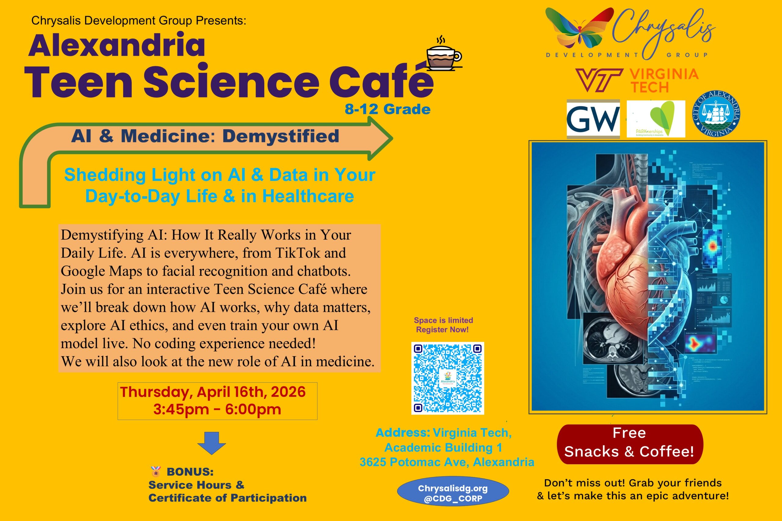 Chrysalis Development Group (CDG) is a nonprofit (501C3) based in Northern Virginia dedicated to advancing educational equity through hands-on STEAM events and programming. We specialize in designing immersive learning experiences that spark curiosity and build identity among youth from underserved communities. Our initiatives span events such as the “Spooky Mad Science Expo”, and programs such as the “Teen Science Café”, and “Be a Health Scientist”, all aimed at promoting STEM education and empowering the next generation of science leaders.