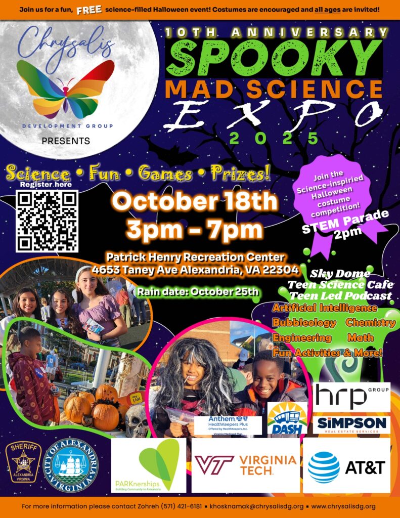 We are excited to invite your organization to partner with Chrysalis Development Group for our milestone 10th Annual Spooky Mad Science Expo on October 18, 2025, from 3:00 PM to 7:00 PM at the Patrick Henry Recreation Center in Alexandria, Virginia. Our sponsorship deck is attached. As a 501(c)(3) nonprofit organization, Chrysalis Development Group is committed to providing affordable, stimulating STEAM programming to elementary, middle, and high school students throughout Northern Virginia. Our annual Spooky Mad Science Expo has grown from a small community gathering into the region’s premier family science event, expecting over 2,500 attendees this year and serving families across northern Virginia.
